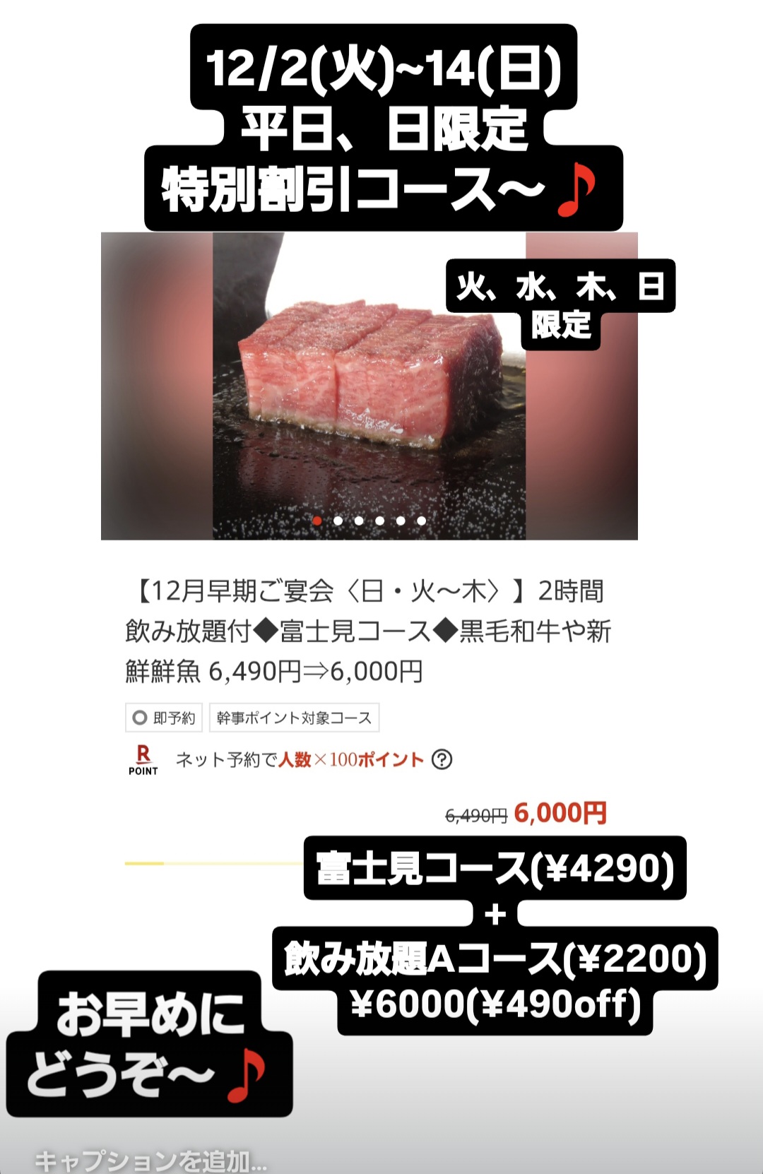 【12月早期予約特別コース】 12/2(火曜日)~14(日曜日)までの 平日(火、水、木)日曜日の限定割引コース を作りました~🎵 富士見コース(¥4290) + 飲み放題Aコース(¥2200) ¥6490のところ¥6000(2名様~) をご用意いたしました~🎵 12月前半のご宴会、女子会、飲み会、忘年会など 是非御予約 お待ちしております~
