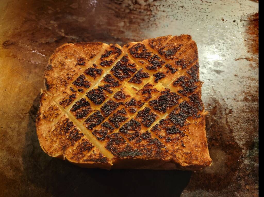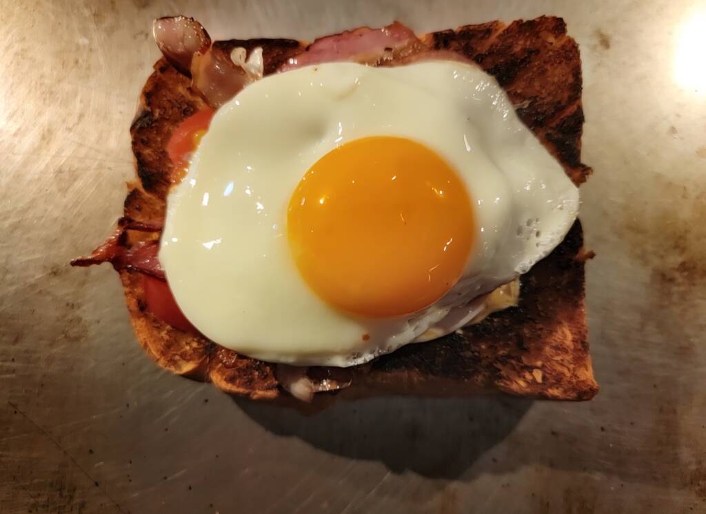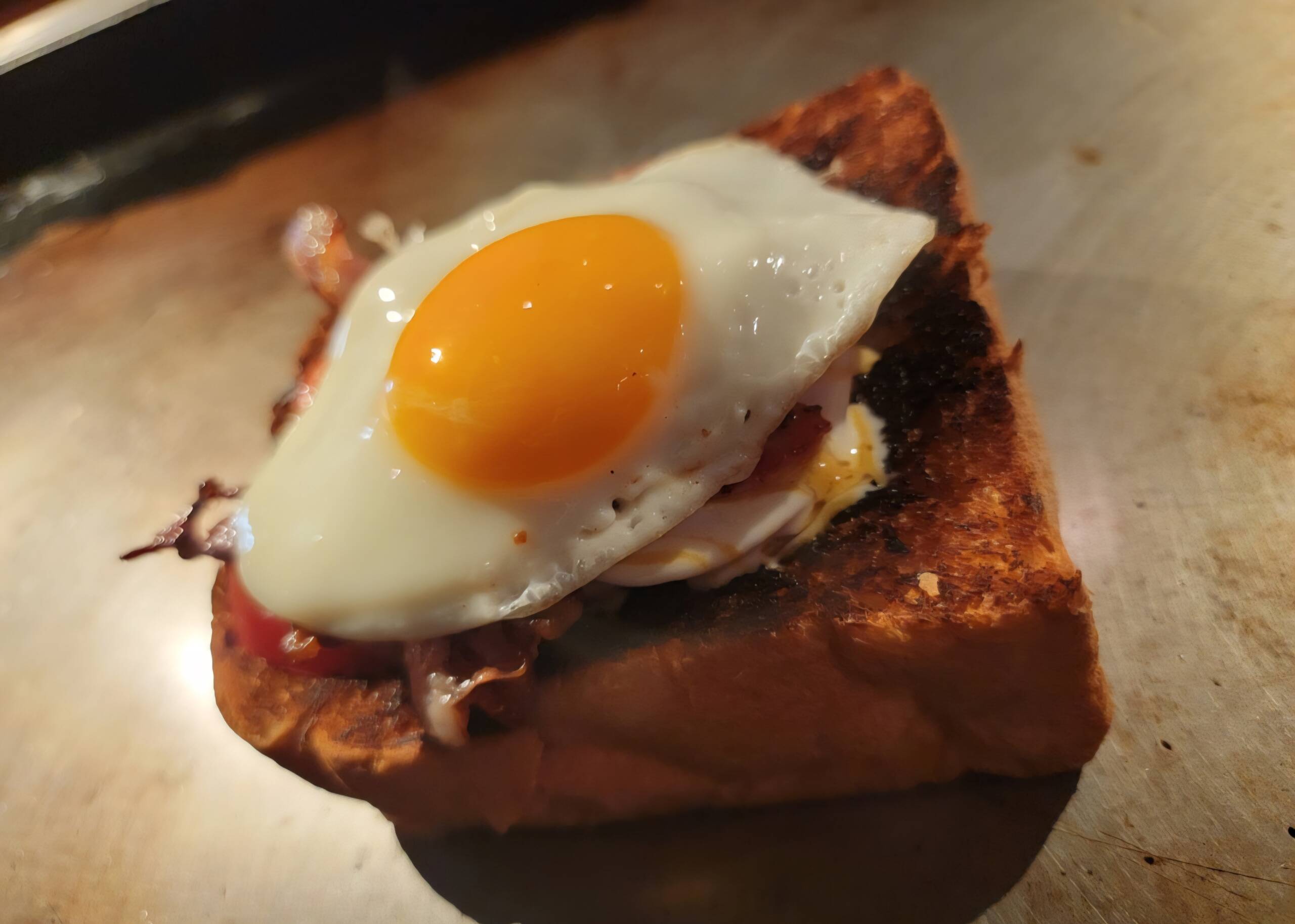 【特別メニュー ベーコンエッグトースト】 お客様から ベーコンエッグをパンにのせてほしい~ と オーダーいただいたので~🎵 トーストはバターたっぷり、こんがりと ベーコンエッグを鉄板で焼いて その間に ハニーマスタードをはさんで 出来上がり~♥️ めっちゃ美味しそうに 出来上がりました~