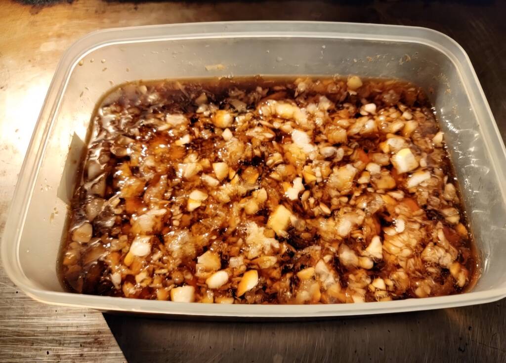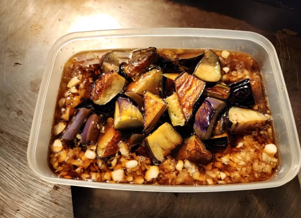 【茄子のみぞれ煮浸し(コースの先付け)】 これはメニューでもなく、まかないでもなく コースに付いてくる 【先付け】の一つとして仕込みました~ 茄子を乱切りにして 鉄板で胡麻油で焼いてしんなりとしたら 特性のダレに漬け込みます~🎵 この浸けダレは 茄子の煮浸しに使うものと同じですが そこに大量の鬼おろしを 入れてよりさっぱりと~🎵