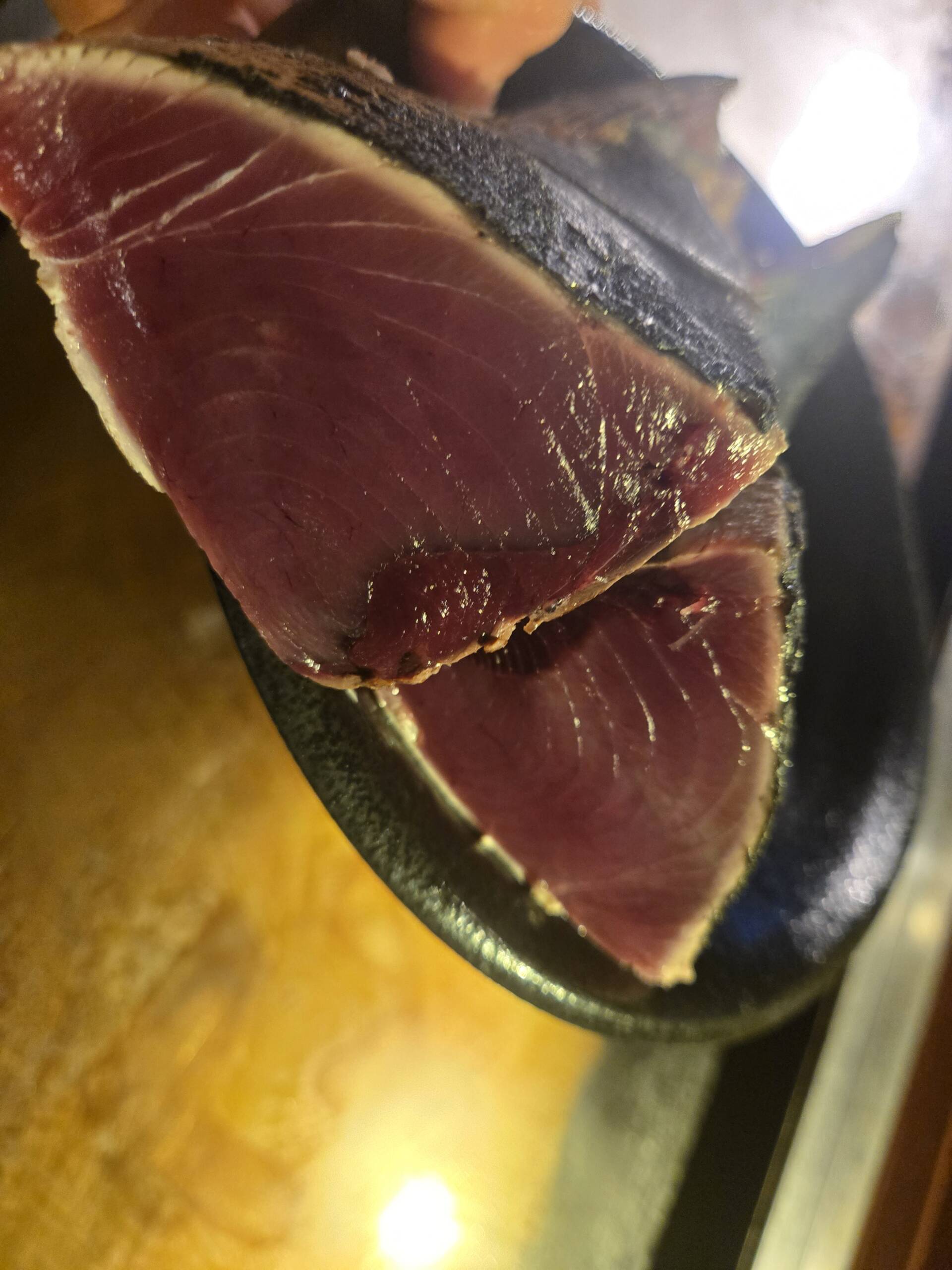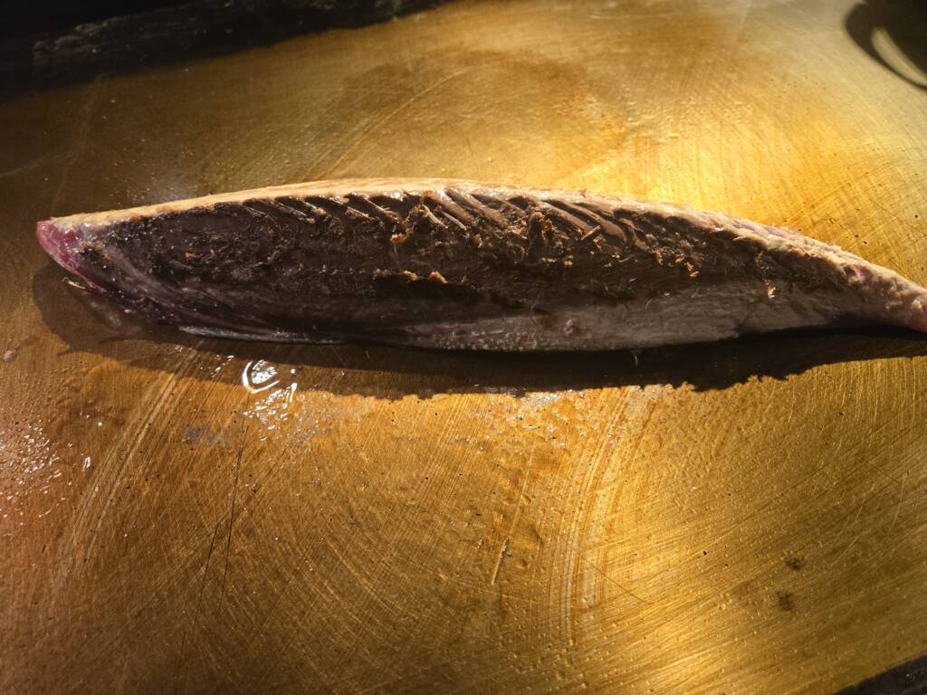 【かつをのたたき~ボンズスタイル~】 春先、秋先の2シーズンに 初かつをと戻りかつをとして おすすめメニューとして恒例の逸品~🎵 その作成動画を~♥️ 藁ではさすがに仕込めないので 鉄板焼でのやり方で 表面を炙り焼き 皮面は強めに 身の面は軽めに その後〆て出来上がりです~👍 これを厚めにカットして ボンズ特製のタレをかけて 召し上がっていただきます~♥️ 大変人気のおすすめメニューです~