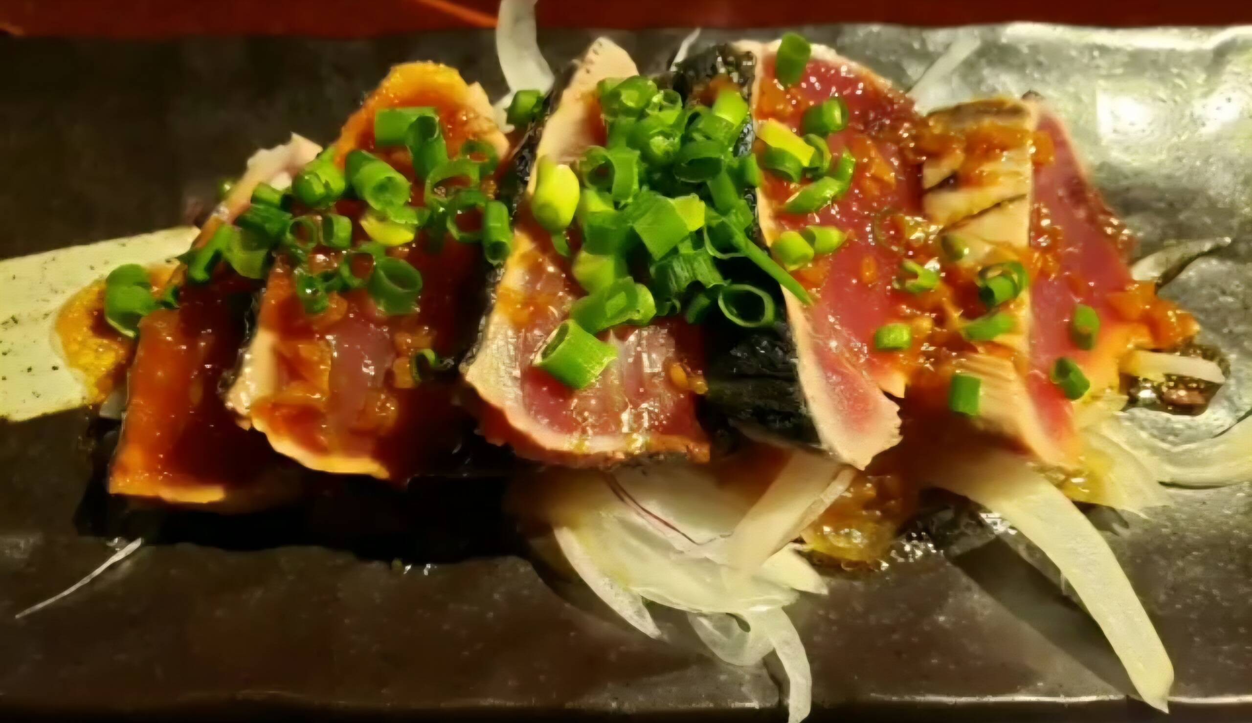 【かつをのたたき~ボンズスタイル~】 旬のかつをを鉄板で炙り焼きして 〆て厚めにカットして盛り付けてます~♥️ これがボンズスタイル、 特製タレが自信を持ってかつをに合う~♥️ にんにくの効いたこのタレを たっぷりかけて召し上がっていたたきます~ 毎年、2回 戻りかつをと初かつをの時期は、 人気おすすめメニューです~🎵